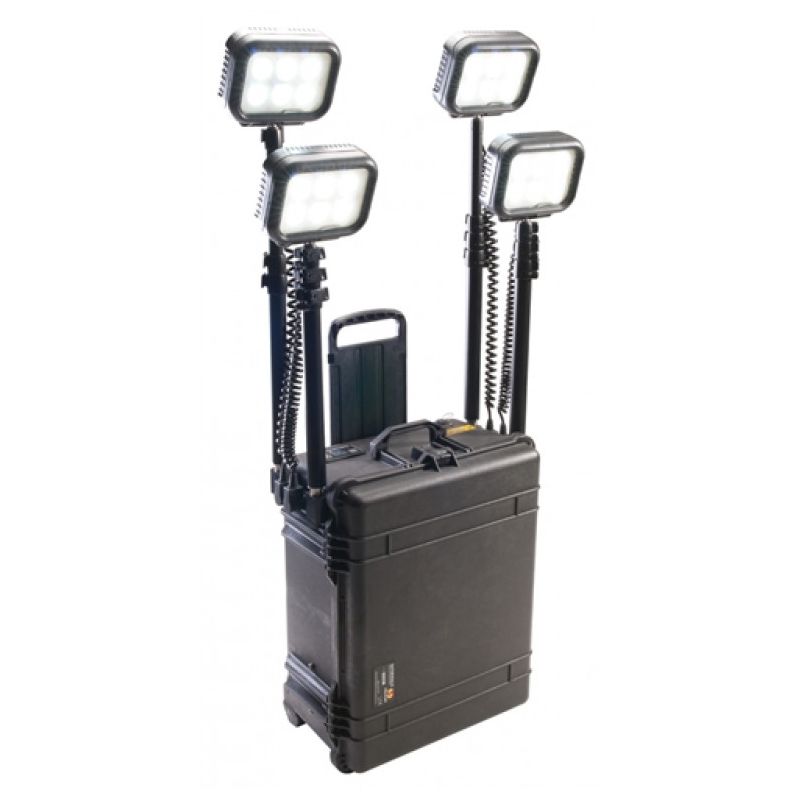 All new and more powerful 9470 Remote Area Lighting System (RALS) provides convenient and ecologically responsible alternatives to wasteful generator powered lights. Engineered with the Intelligent Control System which calculates and displays current battery life. Additionally, it allows the user to regulate the intensity of the light, choose the desired run time or select from three pre-set power levels. Built with versatility in mind, the 9470 RALS features four telescopic masts (each extends to nearly 6 feet) and four 360° articulating light heads. The system's next-generation LEDs combine to radiate up to 24,000 lumens (6,000 per light head). Powered by rechargeable batteries, the system offers remote activation via a Bluetooth app which allows varied light output from 100% - 0%. For extended applications, the 9470 can run continuously on wall power. The ability to leave on charge allows you to always be prepared. A 12volt power port including a dual USB adapter provides power for multiple peripheral devices. Built self-contained in a tough-as-nails Peli case, the 9470 is compact and provides easy ground transport with a retractable pull handle and stainless steel ball-bearing polyurethane wheels.