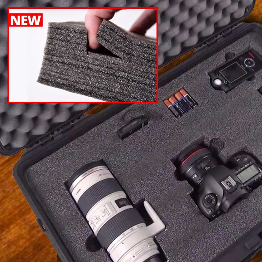 Alternativt kan du være Multilayer Foam som er vores eget skum og giver dig en unik mulighed for at indrette din Peli Case så dit udstyr passer perfekt. Multilayer Foam er en PE specialskum der er præ-lamineret i lag og kan nemt skæres og formes, så det passer til præcist til dit udstyr, værktøj m.m. Glemt alt om besværligt plukskum der smuldrer, er blødt og kun kan tilpasses i firkanter og så alligevel går fra hinanden efter kort tid. Med multilayer foam får du en mellemhård skumtype, du hurtigt tilpasse til dit udstyr, ved at skære rundt om dit udstyr og helt simpelt skrælle skummet i den dybde du ønsker.