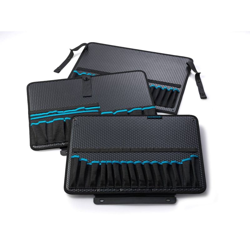 - Optimerede Værktøjsslots: Flere lommer og stropper i forskellige størrelser holder dine værktøjer organiserede og på plads, med lyseblå kanter for hurtig synlighed.