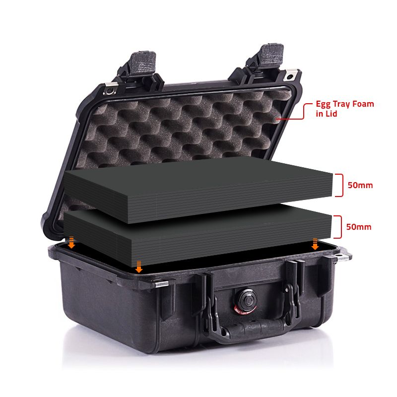 Peli 1400 Case med multilayer skum. Multilayer Foam er en PE specialskum der er præ-lamineret i lag og kan nemt skæres og formes, så det passer til præcist til dit udstyr. Glemt alt om besværligt plukskum eller blødt skum du ikke kan skære i. Med multilayer foam får du en mellemhård skumtype, du hurtigt tilpasse til din riffel og udstyr, ved at skære rundt om dit udstyr og helt simpelt skrælle skummet i den dybde du ønsker. Leveres med 2-Lag skum (2 x 50 mm MLF og æggebakkeskum i låg.