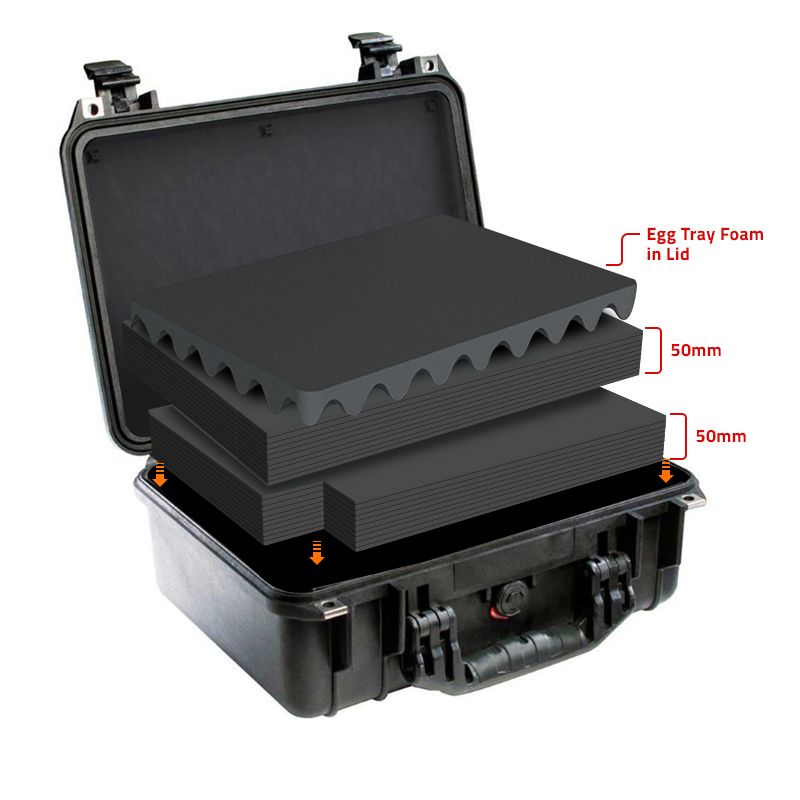 Peli 1450 Case med multilayer skum. Multilayer Foam er en PE specialskum der er præ-lamineret i lag og kan nemt skæres og formes, så det passer til præcist til dit udstyr. Glemt alt om besværligt plukskum eller blødt skum du ikke kan skære i. Med multilayer foam får du en mellemhård skumtype, du hurtigt tilpasse til din riffel og udstyr, ved at skære rundt om dit udstyr og helt simpelt skrælle skummet i den dybde du ønsker. Leveres med 3-Lag skum (2 x 50 mm MLF + 1 x 5 mm og æggebakkeskum i låg.