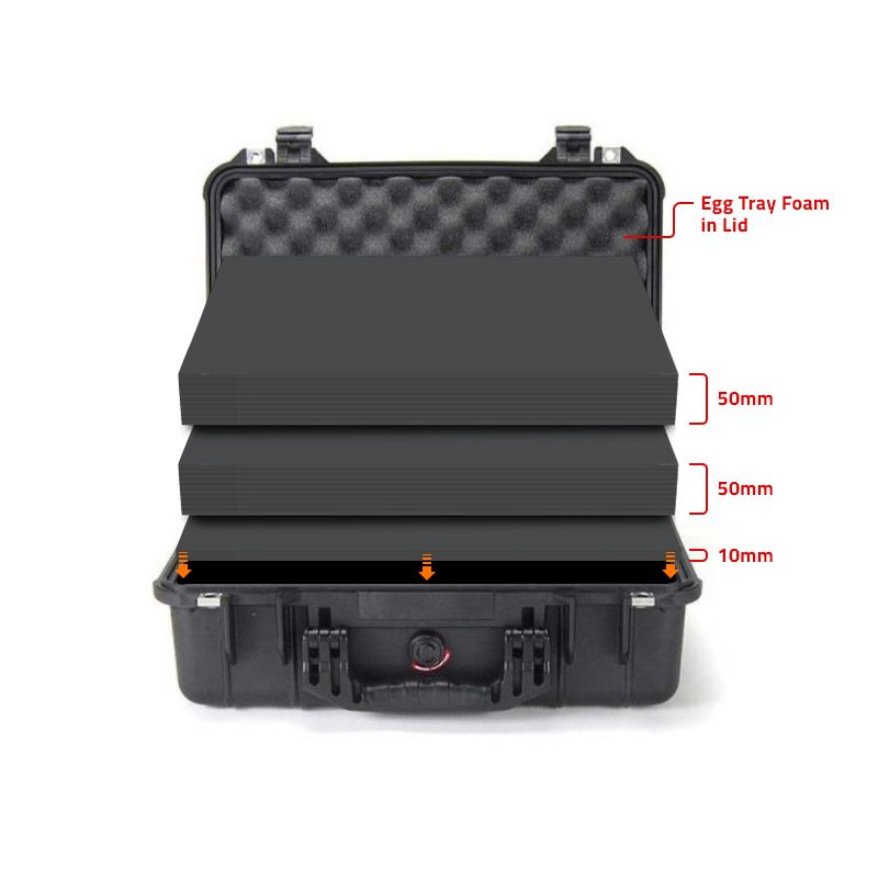 Peli 1500 Case med multilayer skum. Multilayer Foam er en PE specialskum der er præ-lamineret i lag og kan nemt skæres og formes, så det passer til præcist til dit udstyr. Glemt alt om besværligt plukskum eller blødt skum du ikke kan skære i. Med multilayer foam får du en mellemhård skumtype, du hurtigt tilpasse til din riffel og udstyr, ved at skære rundt om dit udstyr og helt simpelt skrælle skummet i den dybde du ønsker. Leveres med 3-Lag skum (2 x 50 mm MLF + 1 x 10 mm og æggebakkeskum i låg.