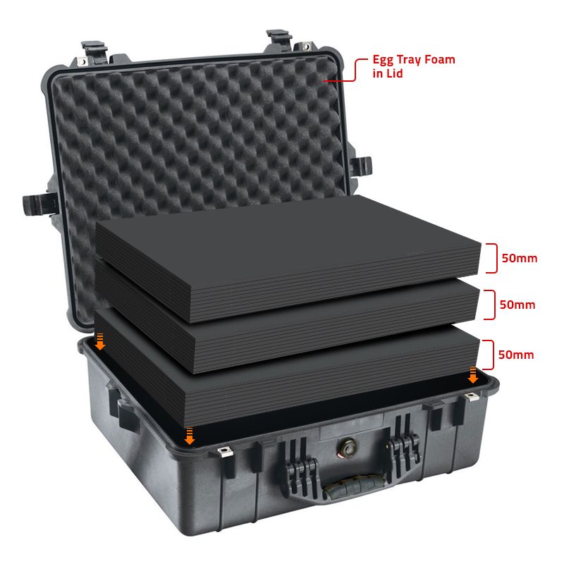Peli 1600 Case med multilayer skum. Multilayer Foam er en PE specialskum der er præ-lamineret i lag og kan nemt skæres og formes, så det passer til præcist til dit udstyr. Glemt alt om besværligt plukskum eller blødt skum du ikke kan skære i. Med multilayer foam får du en mellemhård skumtype, du hurtigt tilpasse til din riffel og udstyr, ved at skære rundt om dit udstyr og helt simpelt skrælle skummet i den dybde du ønsker. Leveres med 3-Lag skum (3 x 50 mm MLF og æggebakkeskum i låg.