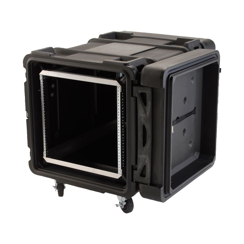 - Dybt 30" 10U ATA-vurderet roto-støbt stød- og vandafvisende rack med 4" hjul og for- og bagræl